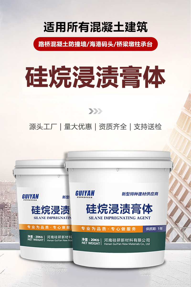正辛基三乙氧基硅烷膏体是混凝土防腐材料,是由长链烷基硅氧烷和乳化剂、分散剂、渗透剂在机械和物理作用下制备的一种高固含量的膏状材料。其中硅烷含量不低于80%,是一种混凝土防腐的理想材料。强渗膏体对混凝土的保护机理,与普通的液体硅烷浸渍剂相同。硅烷与水反应,释放出乙醇,形成聚合的硅树脂网络,在毛细管的表壁上形成一层憎水性的薄膜,并渗透混凝土内部≥3mm以上。与液体硅烷浸渍剂的优势在于,附着力更强,渗透能力更强,施工损耗更小。