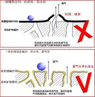渗透性有机硅烷表面防护涂料是防水涂料的一种,与其它防水涂料的区别在于:前者利用混凝土的可渗透性,渗入到混凝土表面一定深度,进行浸渍保护;而后者将孔隙完全堵塞或在表面将毛细孔封闭。所以有机硅浸渍保护,不仅能大幅降低混凝土毛细孔的吸水率、减轻氯离子侵蚀、预防冻融破坏、钢筋腐蚀及霉菌滋生,还能保证长期耐久性(耐碱、耐紫外线)。
