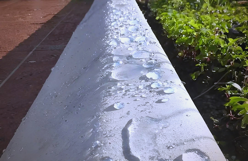 这层疏水膜犹如无数小雨伞般排列在混凝土表面和毛细孔道中,将原本亲水的混凝土表面转变为疏水表面。由于疏水膜的表面张力低于水,因此会产生毛细逆气压现象,从而显著降低混凝土的吸水率。同时,硅烷浸渍材料因其低表面能而使水与混凝土产生“荷叶”效应。通过物理憎水和化学结合的双重作用,硅烷浸渍不仅能减少氯离子侵蚀和混凝土碳化,还能保持混凝土的透气性,进而提升混凝土的耐久性。