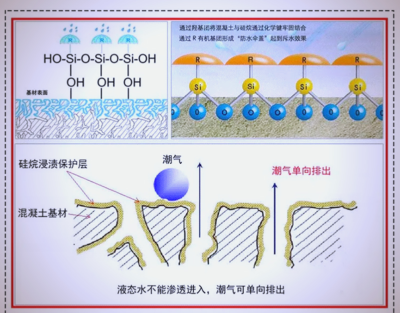 —硅烷浸渍技术通过烷基硅烷与混凝土中的碱性物质及水分的反应,在混凝土空隙内外形成一层憎水性保护膜。该膜有效阻隔了水分、氯离子等有害物质的深入,进而增强了混凝土的防水抗渗性及耐久性。值得一提的是,这一保护膜是通过渗透至混凝土表层而构筑,并未改变其原有体积,因此对建筑外观毫无影响。即便其表面遭受轻微磨损,也无需担忧其封闭防护功能会受到实质性损害。